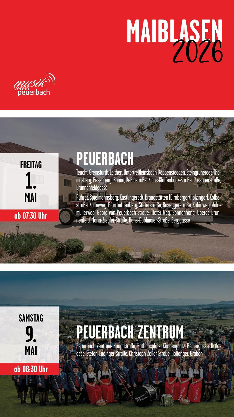 Zum Maiblasen am Freitag, 1. Mai 2026 sowie Samstag, 9. Mai 2026 ab 07:30 Uhr besuchen wir folgende Ortschaften: