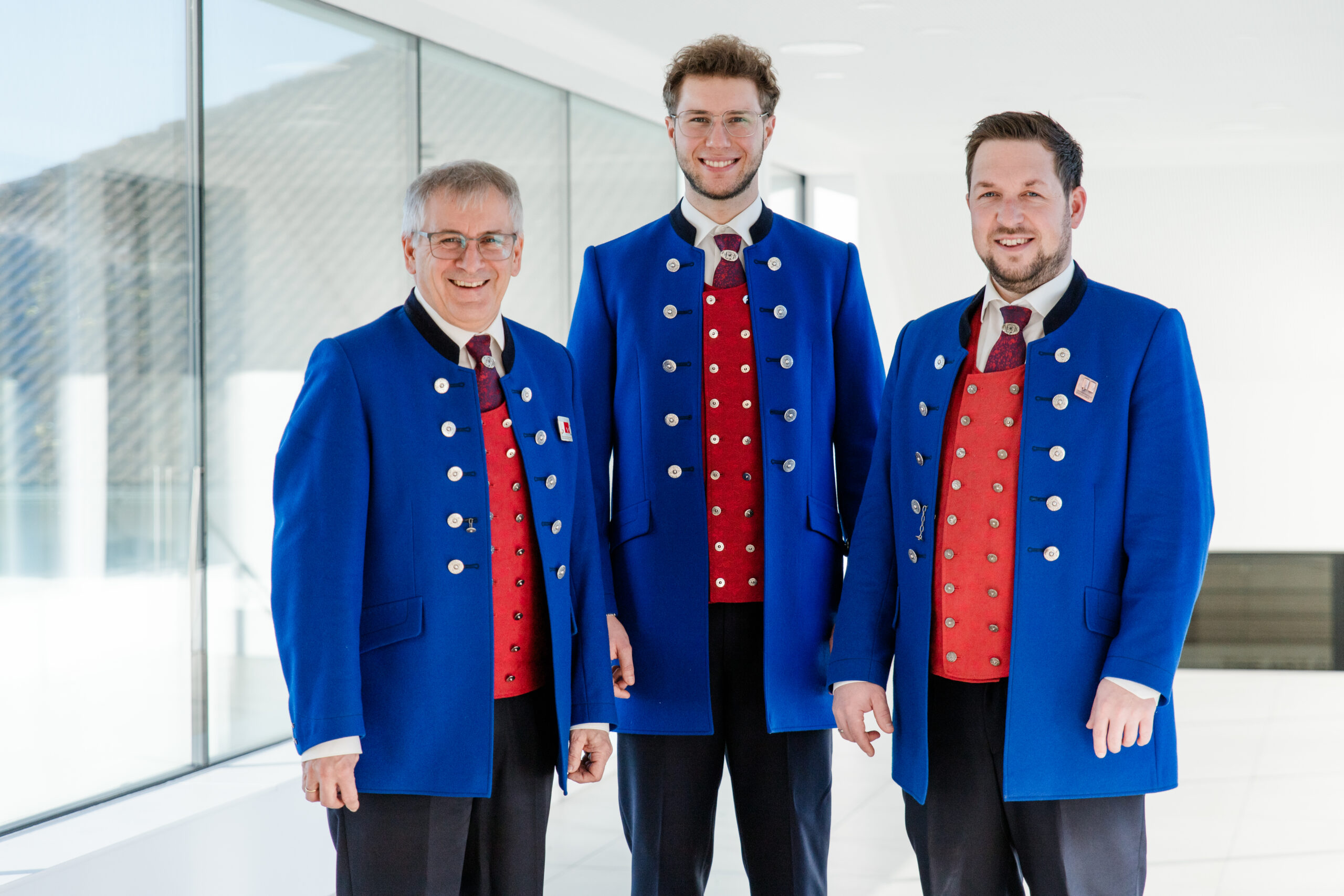 Obmann Johann Pühringer (links) mit unserem neuen Kapellmeister Andreas Steiner (Mitte) bei der Taktstockübergabe von Ehrenkapellmeister Patrick Gruber (rechts) im Dezember 2025.